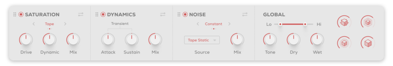 - 5 Main FX Parameters: Saturation, Dynamics, Noise, Lo-Cut, Hi-Cut