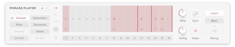 - Phrase Rate, Sync, Swing, Steps, Latch, Beat Retrigger controls