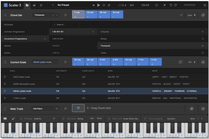 - 100s of Chord Sets and Scales categorised by mood, artist and genre. Scaler 3 greatly expands the number of chord sets and makes them easier to work with.