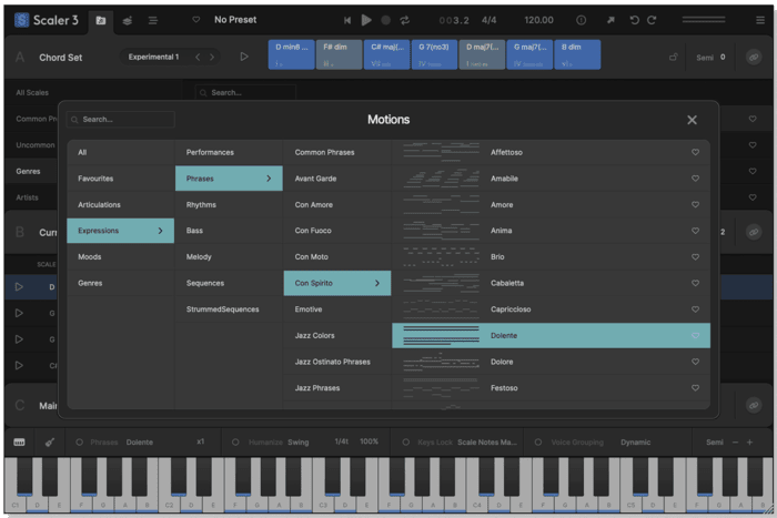 Scaler's beloved Phrases, Performances, Melodies, and Basslines are reimagined as Motions, now with mood-based tags for easier browsing. Scaler 3 introduces hundreds of new Motions crafted by professional musicians, including the all-new Passages Motion.