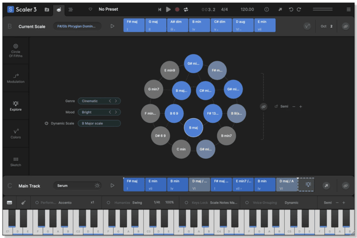 Discover a Harmonic Universe of chords untied to any specific scale. Categorized by genre and feel (EG, Dark, Bright, Neutral), the Explore page suggests compatible and experimental chord progressions, unlocking new paths for unique and bold harmonic structures.