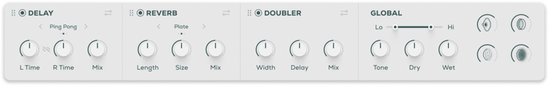 - 3 Rearrangable Effects: Doubler, Delay, Reverb