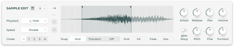 The Edit page is the central hub for refining and making the library of samples your own. Adjust start and end points, manipulate playback speed and direction, and tweak the timbre with pitch and formant controls.