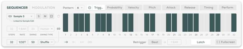 - Global / Track Step Rate, Sync, Swing, Steps, Latch, Beat Retrigger controls
