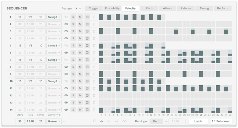 - Track Trigger, Velocity, Probability, Attack, Release, Timing and Perform