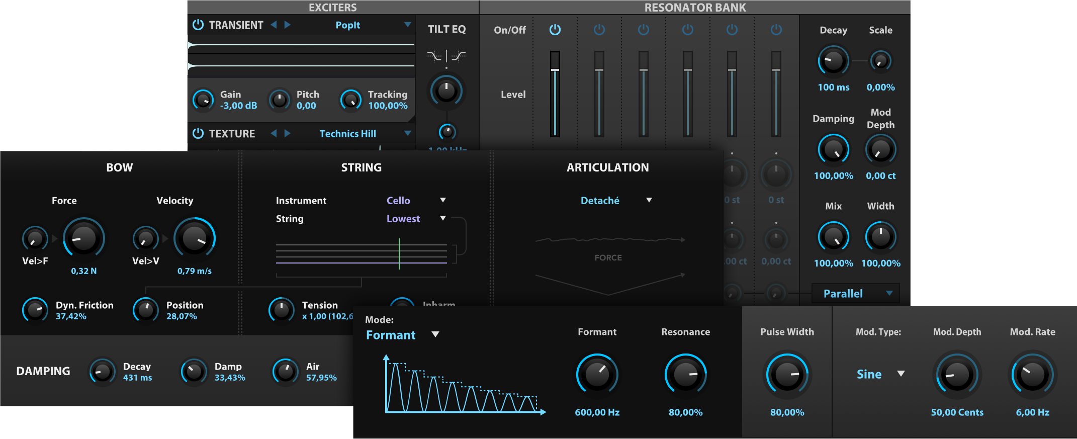 Falcon 3 comes with 3 all-new oscillators! VOSIM (a tribute to vintage vocal synths) offers 2 unique modes for creating formant sounds, Bowed String gives you a virtual bow and string with multiple articulation modes, and Harmonic Resonator gives you a multi-layer exciter feeding 6 tunable resonators with coupling.