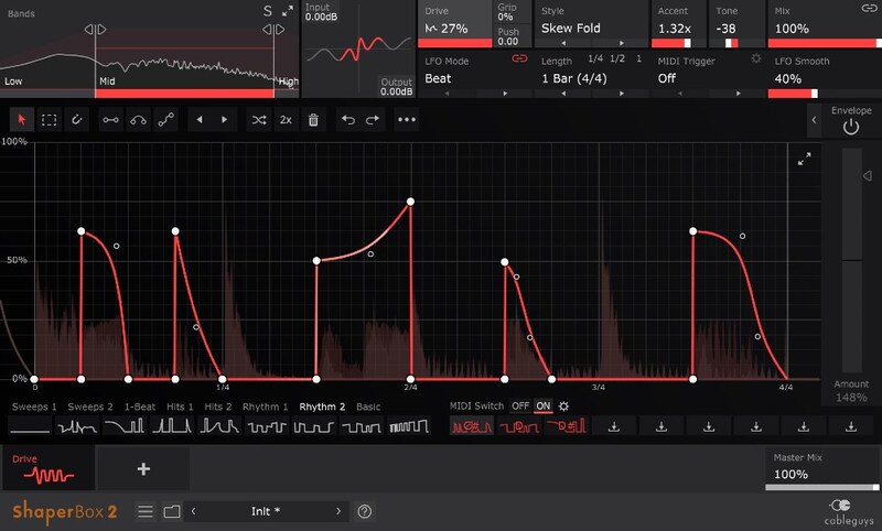 Belonging to Cableguys popular multi-effects plugin ShaperBox 2, DriveShaper is the seventh of eight transformative effects siblings, although it can be used independently from the others. Cableguys plugins make modulation easy, with straightforward LFOs that allow fluid editing of modulation shapes, and responsive envelope followers that react to audio. This makes DriveShaper an enticing prospect for anyone looking for animated, rhythmic distortion effects.