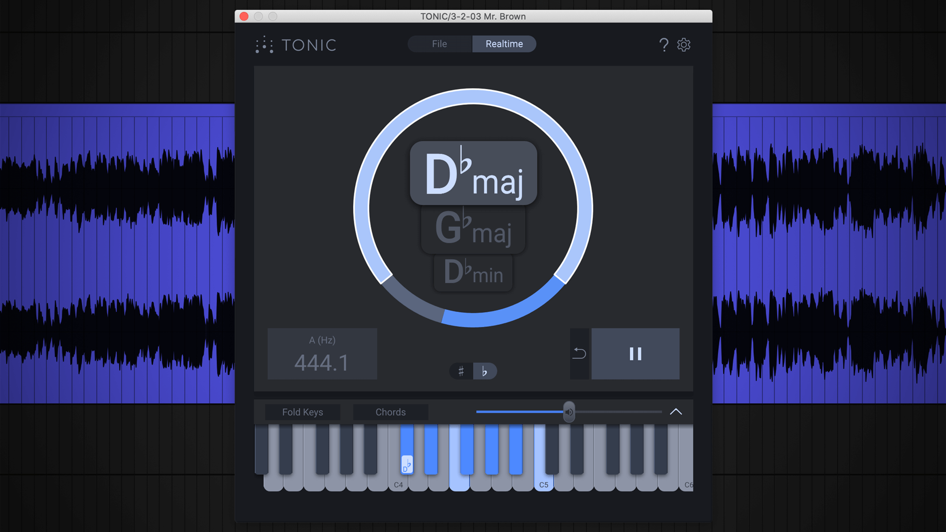 Put TONIC on any audio track and hit play in your DAW. TONIC will analyze the sound in real-time and present you with up to three suggested keys with a graphical representation showing the confidence level. Fold-out the keys panel and try out notes and chords for the suggested keys to find the perfect fit.